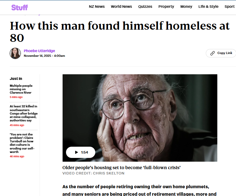 Stuff reports: As the number of people retiring owning their own home plummets, and many seniors are being priced out of retirement villages, more and more people over 65 are being left with nowhere to live. Phoebe Utteridge reports.