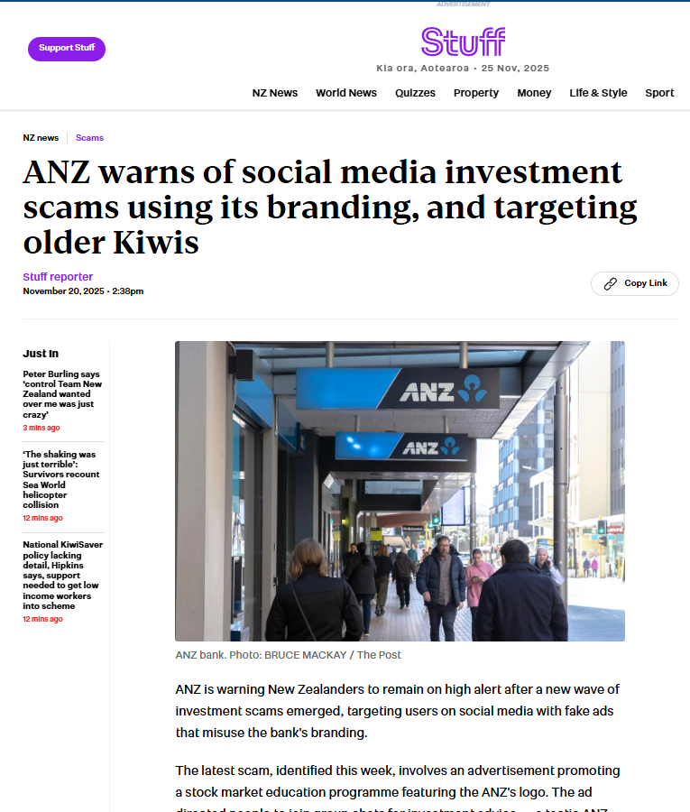 ANZ warns of social media investment scams using its branding, and targeting older Kiwis