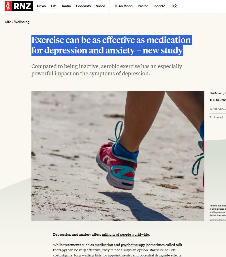 This story by RNZ: Compared to being inactive, aerobic exercise has an especially powerful impact on the symptoms of depression.