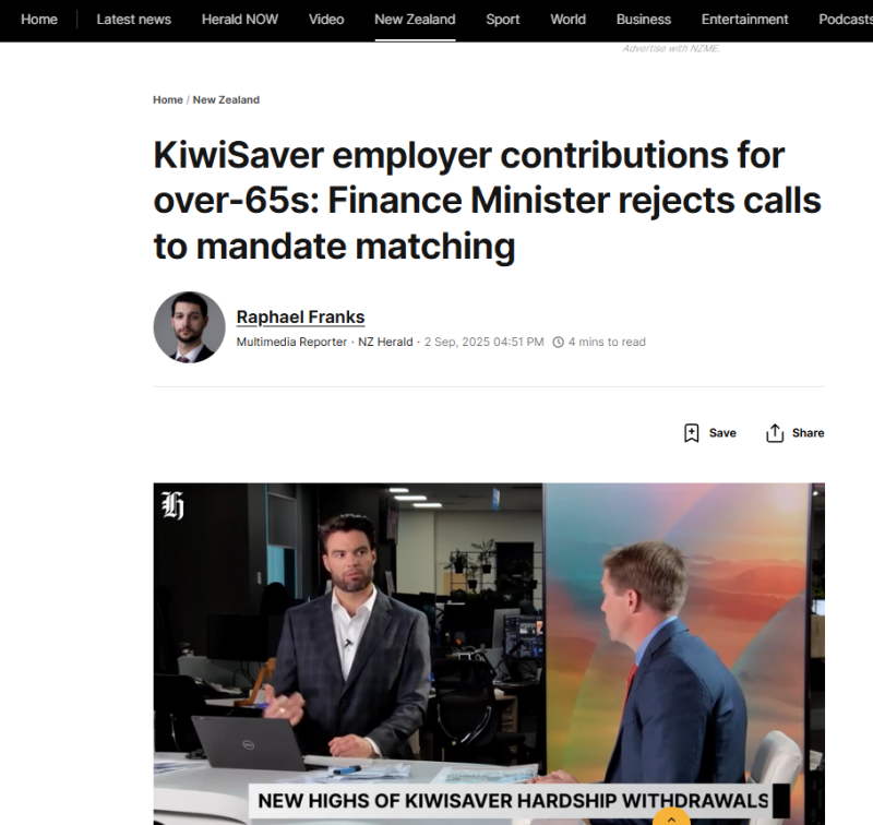 The Hearald reports: The Minister of Finance is dismissing calls to mandate employers to contribute to the KiwiSaver accounts of their over-65 workers.
