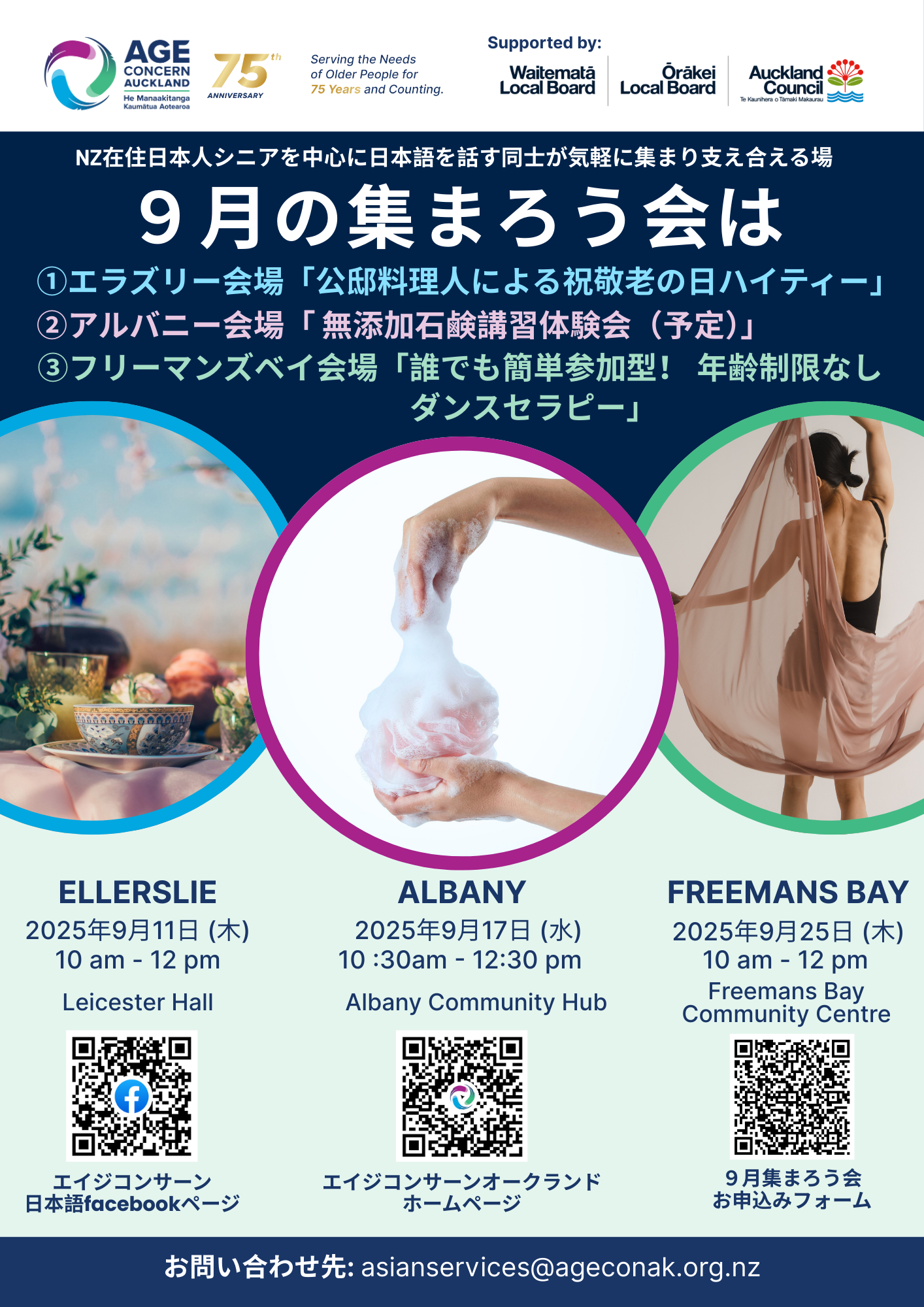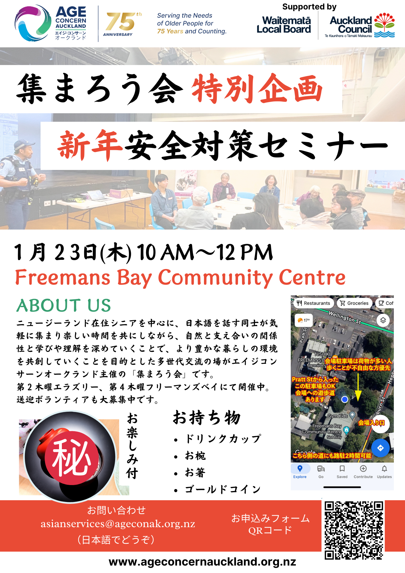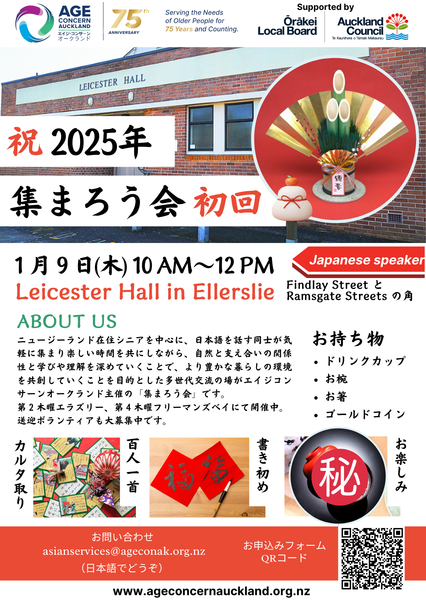「集まろう会」は、ニュージーランドに住む日本語話者のシニアの皆さまを中心に気軽に集い、同じ時間を共にすることで、多世代の相互理解、互いの存在価値を認め合って、楽しく安全に交流できる場です。