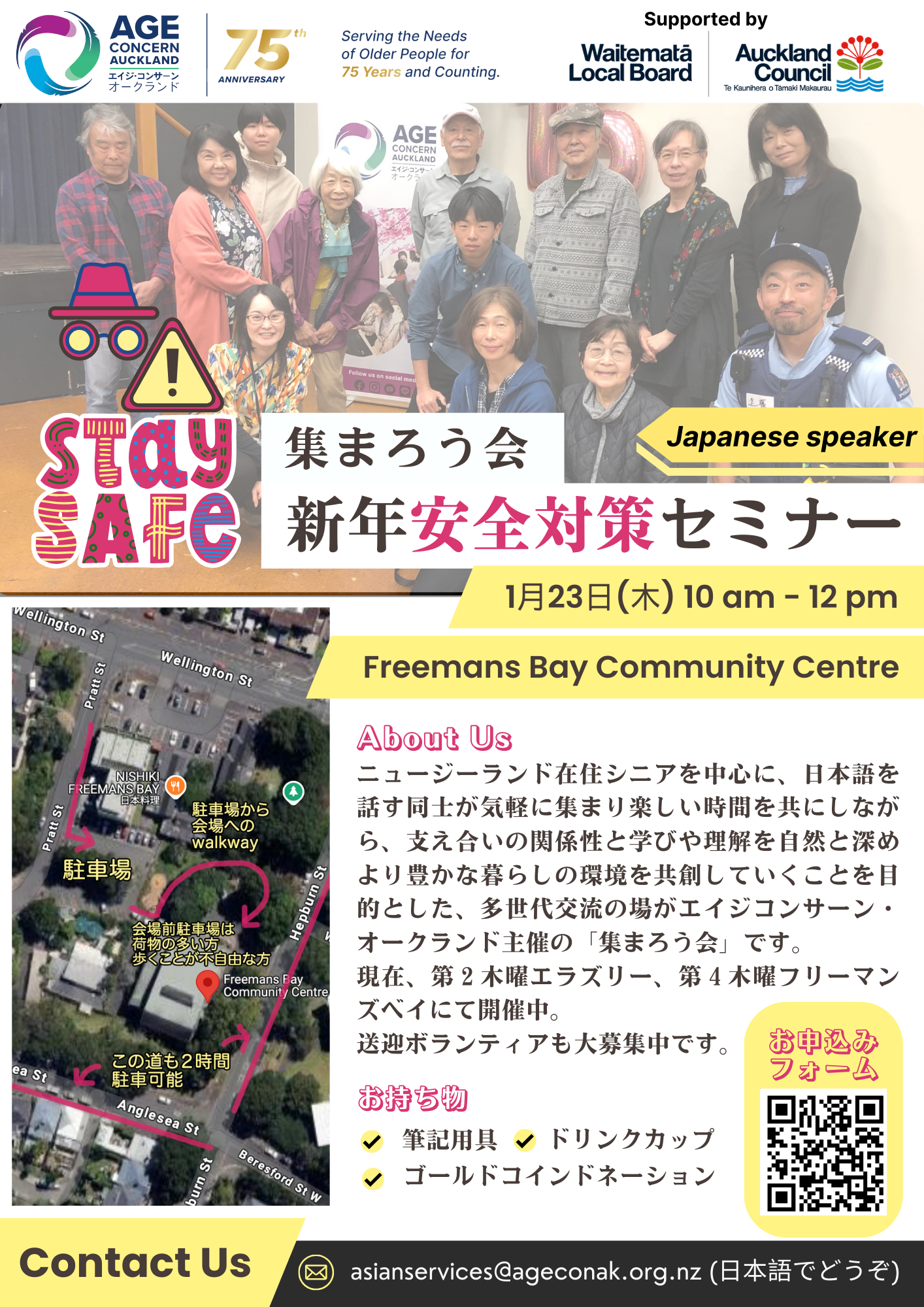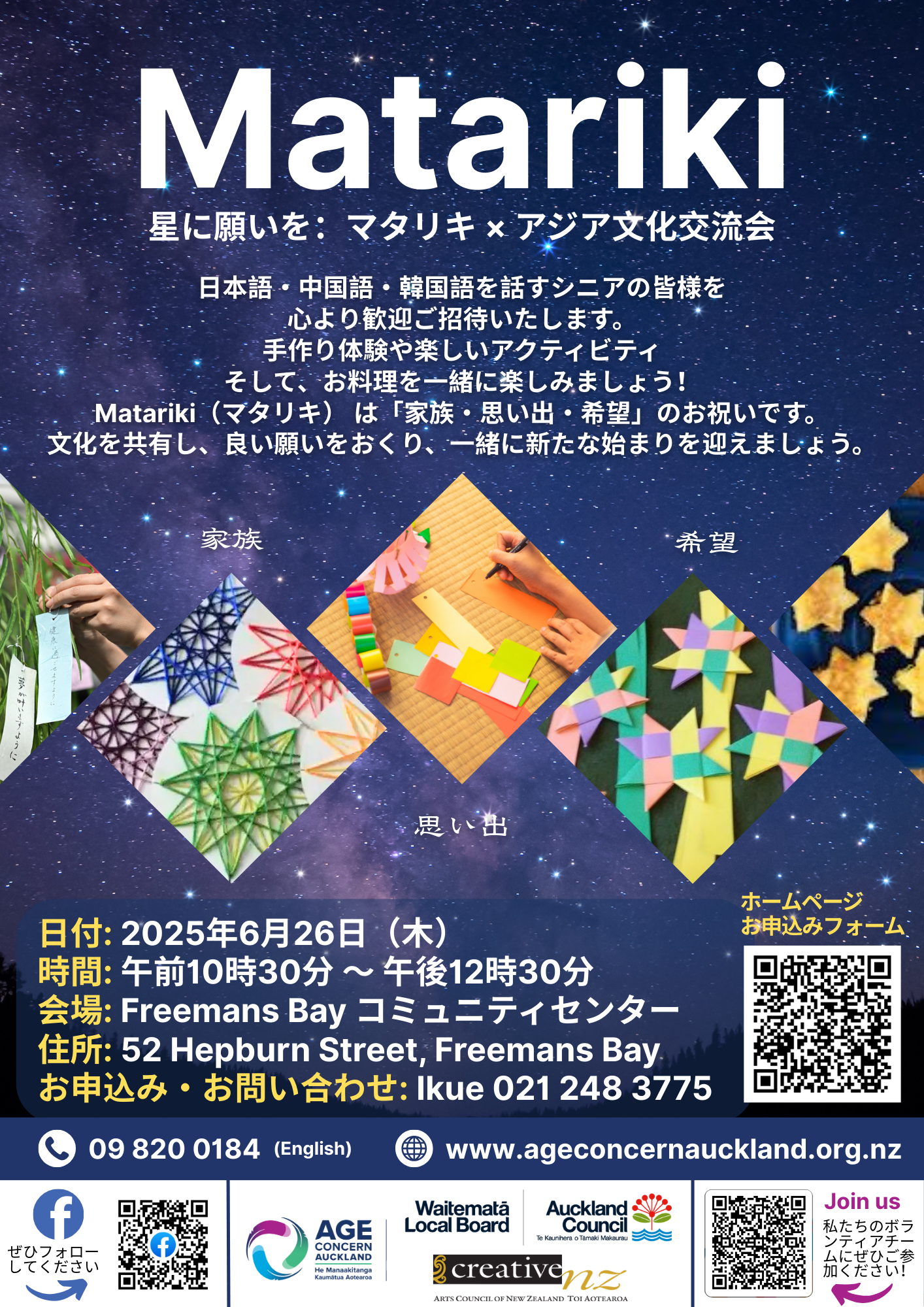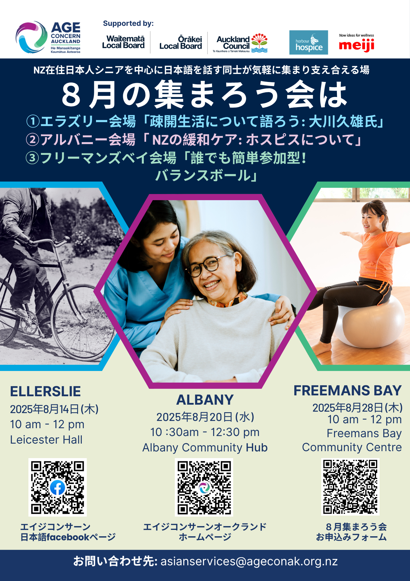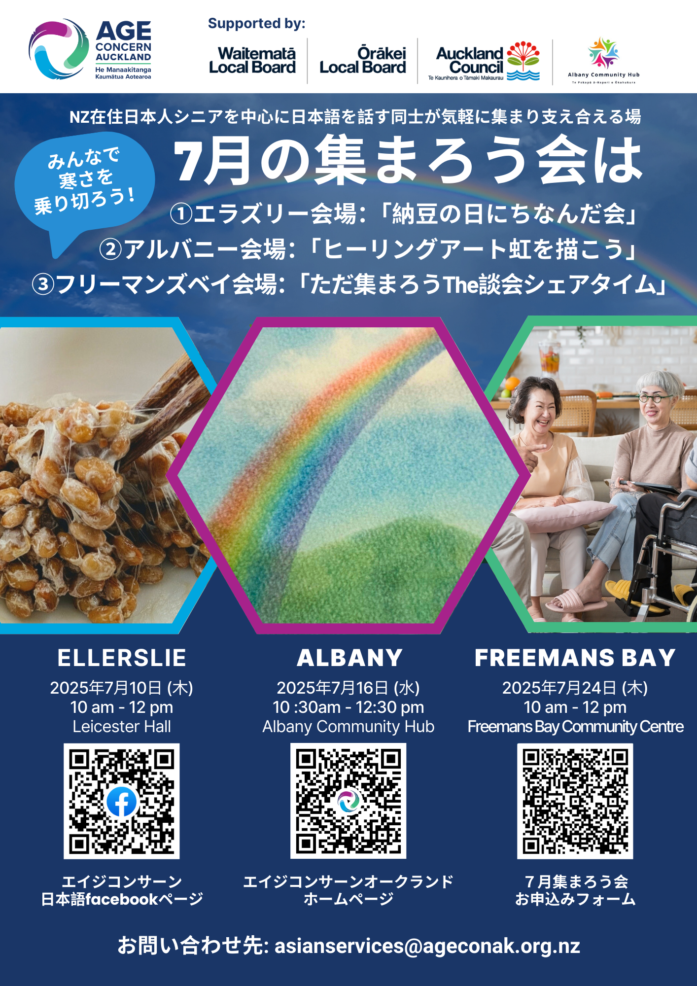 「集まろう会」は、ニュージーランドに住む日本語話者のシニアの皆さまを中心に気軽に集い、同じ時間を共にすることで、多世代の相互理解、互いの存在価値を認め合って、楽しく安全に交流できる場です。
